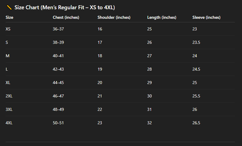 📏 Size Chart (Men’s Regular Fit – XS to 4XL)